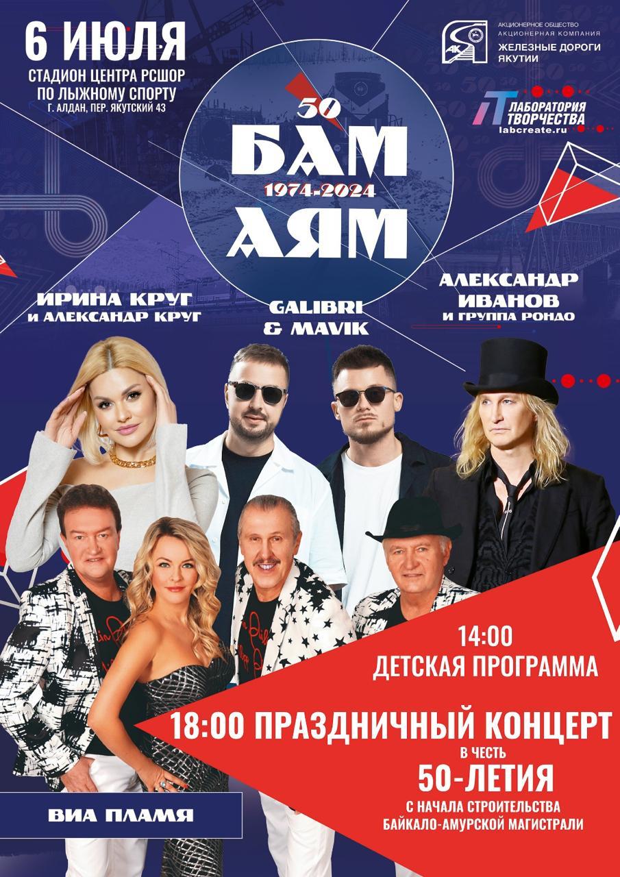 Участников мероприятия и гостей города Алдана поздравят легендарный вокально-инструментальный ансамбль «Пламя», Александр Иванов и группа «Рондо», Ирина Круг и Александр Круг, внук легендарного певца Эдуарда Хиля – Эдуард Хиль, популярный дуэт Galibri & Mavik и другие творческие коллективы.
