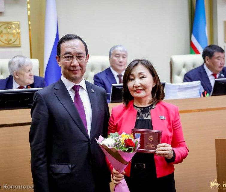 Сегодня в парламенте республики состоялась итоговая сессия шестого созыва депутатов. Глава республики Айсен Николаев наградил знаком отличия «Гражданская доблесть» председателя постоянного комитета Госсобрания по делам семьи и детства Алену Атласову.