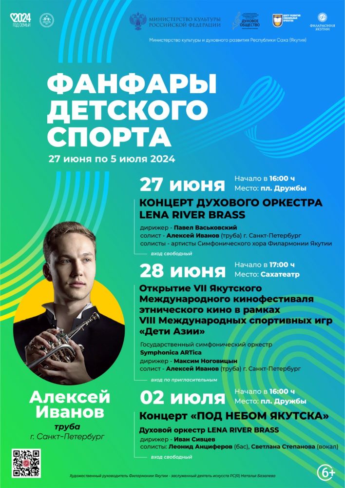 Концерт под открытым небом состоится на площади Дружбы в рамках VIII игр «Дети Азии». Проект «Фанфары детского спорта» 27 июня запустили Духовое общество имени Валерия Халилова и Филармония Якутии при поддержке Минкультуры России. Старт проекту дал также концерт на площади Дружбы. Перед жителями и гостями Якутска выступил оркестр под управлением Павла Васьковского и артисты Симфонического хора Филармонии Якутии. Солировал победитель и лауреат международных конкурсов трубач Алексей Иванов из Санкт-Петербурга.