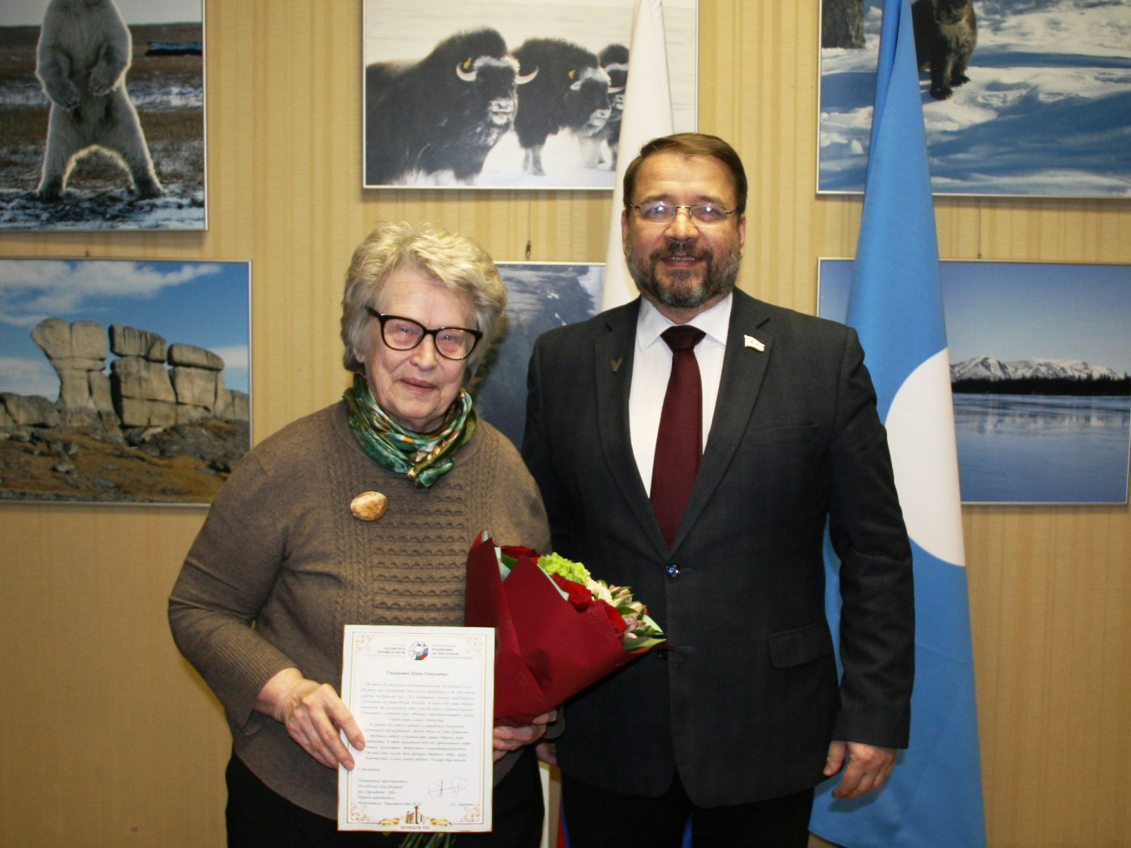 Перед началом встречи заместитель постоянного представителя Якутии при президенте России Юрий Кравцов поздравил участников мероприятия со знаменательной датой и вручил знаки «100 лет Якутской АССР» якутянам – жителям блокадного Ленинграда. Среди награжденных – первый директор школы № 24 г. Удачный Александр Фесенко, геолог Татьяна Селивановская, зоотехник Галина Афанасьева и другие.