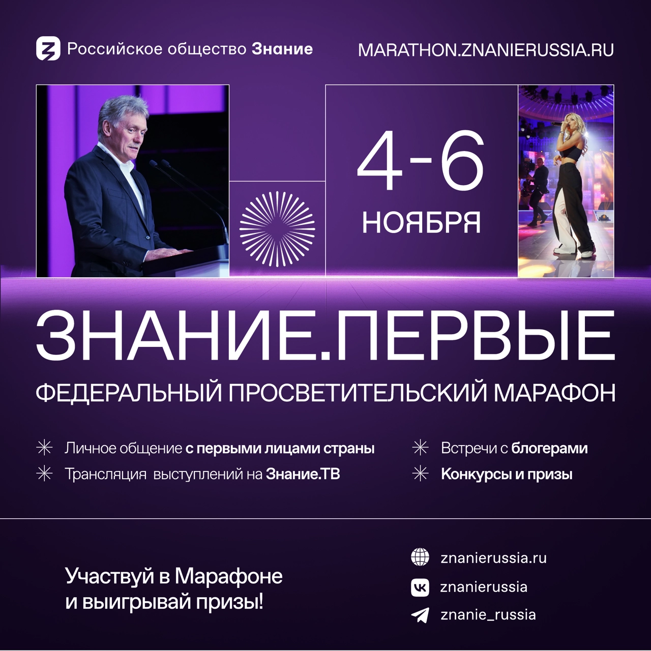 С 4 по 6 ноября 2023 года состоится федеральный Просветительский марафон Российского общества «Знание» — Знание.Первые. Марафон стартует в день открытия Международной выставки-форума «Россия» на ВДНХ в Москве. Марафон будет проходить на шести площадках в разных павильонах.