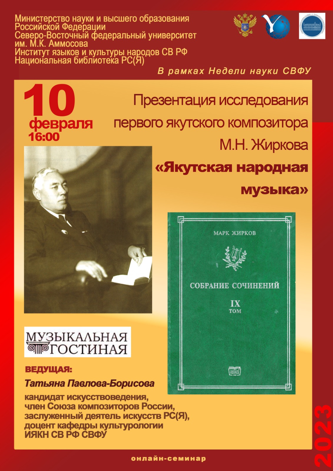 10 февраля 2023 г. в рамках Всероссийской недели науки в г. Якутске в Северо-Восточном федеральном университете им. М.К. Аммосова состоялась презентация исследования первого якутского композитора М.Н. Жиркова «Якутская народная музыка», вышедшего впервые в полномасштабной авторской редакции со всеми приложениями и описаниями в качестве IX тома издаваемого в наши дни Собрания сочинений М.Н.Жиркова. Составителем и ответственным редактором данного тома – выступила доцент кафедры культурологии Института языков и культуры народов Северо-Востока РФ СВФУ им. М.Аммосова – Т.В.Павлова-Борисова, рассказавшая о вкладе М.Н. Жиркова в изучение якутской народной музыки.