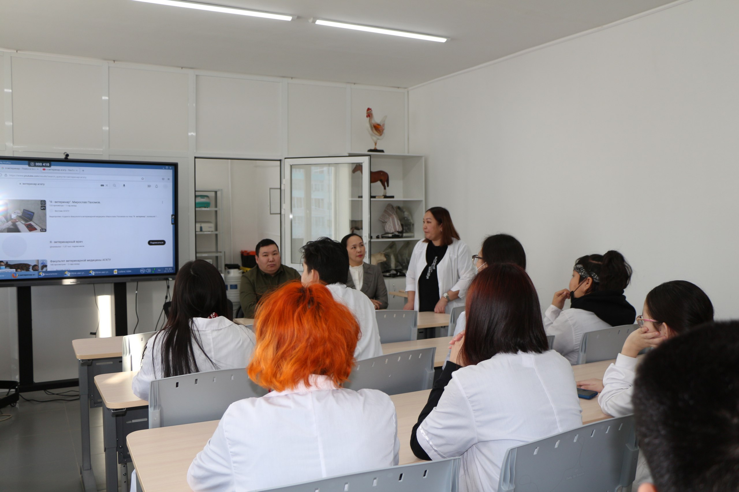 Преподаватели Елена Михайловна Петрова, доцент кафедры ветеринарно-санитарной экспертизы, Владимир Кымович Габышев, старший преподаватель кафедры ВНБ ФиА им. профессора Г.П. Сердцева, Нюргина Илларионовна Алексеева, старший преподаватель кафедры ВНБ ФиА им. профессора Г.П. Сердцева рассказали студентам ветеринарной специальности о направлениях обучения, сроках приема документов в АГАТУ. Преподаватели рассказали о том, какие специальности приобретут выпускники, о практиках, как в республике, так и за рубежом, в каких предприятиях находят рабочие места, показали слайды, ролики о выпускниках университета, которые работают во многих ведущих предприятиях республики, о выпускниках, которые работают и за границей.