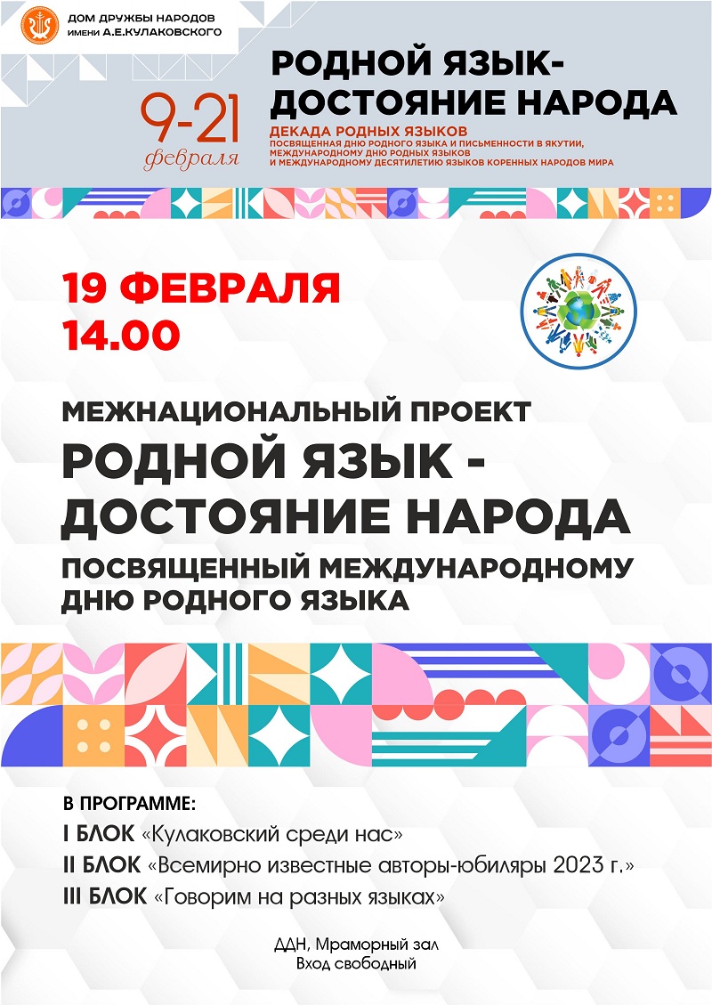 В рамках проводимой АУ РС (Я) «Дом дружбы народов им. А.Е. Кулаковского» Декады родных языков и письменности отдел межнациональных отношений 18 и 19 февраля проводит диктанты по родным языкам и Межнациональный проект «Родной язык – достояние народа». Мероприятия посвящены Международному дню родных языков, учрежденного ЮНЕСКО с целью сохранения языкового и культурного разнообразия, поддержке многоязычного образования.