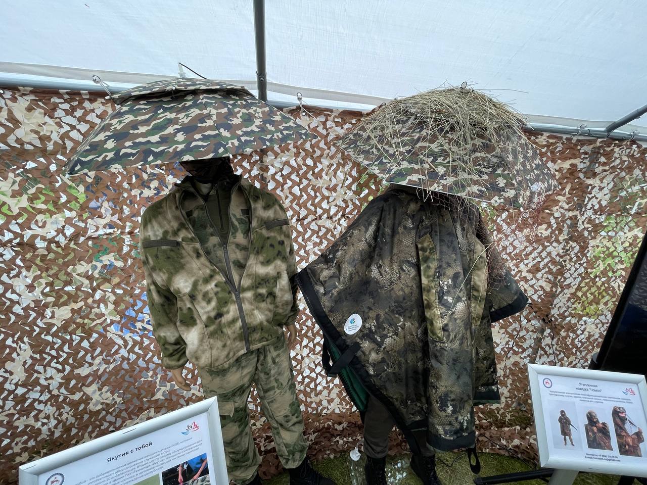 В зоне презентации работы региона по поддержке СВО Якутия презентовала, в частности, беспилотные летательные аппараты, камуфляжные костюмы, квадроцикл, военный купол и костюм снайпера.
