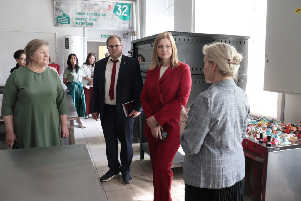 Гости посетили специализированный центр компетенций по кондитерскому делу, оснащённому современным оборудованием, отвечающим всем требованиям и стандартам. Цех является незаменимым помощником не только в учёбе, но и в проведении соревнований. Так, здесь проводятся чемпионаты «Профессионалы», «Абилимпикс», международный конкурс «Мастера Шёлкового пути». Здесь же преподаватели техникума проводят мастер-классы, обучающиеся курсы для населения, занимаются ранней профориентацией школьников.