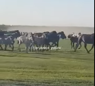 В соцсетях распространилось видео, на котором несколько табунов объединившись прибежали в село Хампа Вилюйского района.
