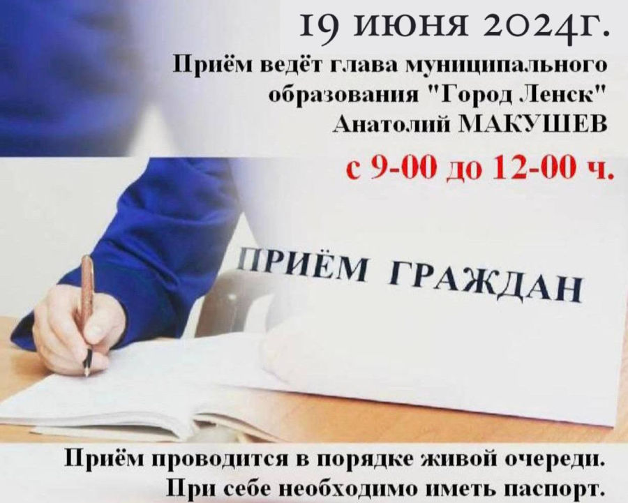19 июня c 09:00 до 12:00 ч. глава муниципального образования "Город Ленск" Анатолий МАКУШЕВ проведёт приём граждан.