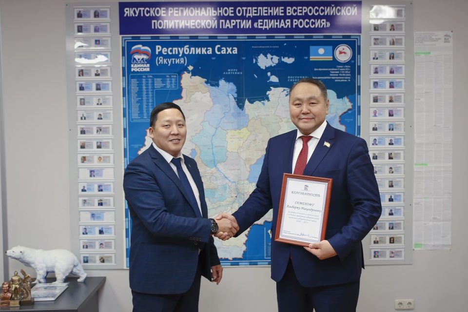 Председателя Якутской гордумы отметили за профессионализм и личный вклад в успешное проведение избирательной кампании В честь 22-летия партии «Единая Россия» председатель Якутской городской Думы Альберт Семенов провел