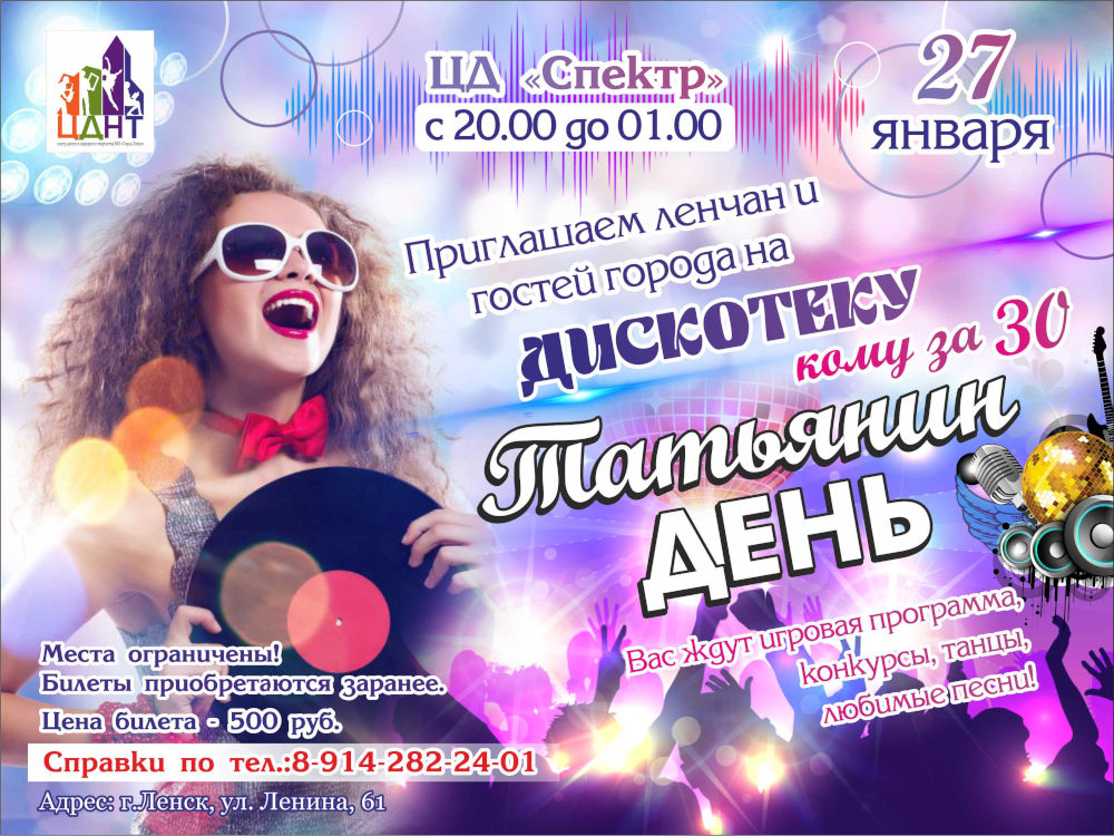 27 января с 20:00 до 01:00 в ЦД «Спектр» пройдет весёлая и зажигательная дискотека «Татьянин день», для тех, кому за 30. Приглашаем ленчан и гостей города Ленска! Вас ждут игровая программа, конкурсы, танцы, любимые песни!