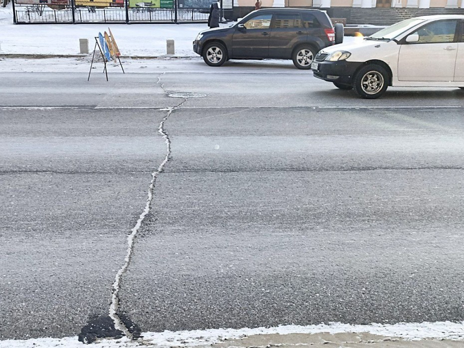 Текст: Yakutia.Info Фото: Якутия.Инфо YAKUTIA.INFO. Крупные трещины образовались по обновленному проспекту Ленина в Якутске.