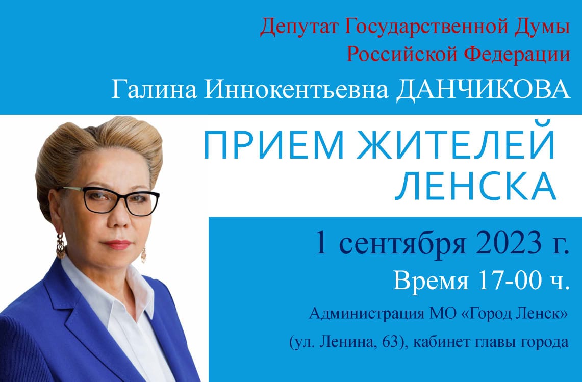 1 сентября 2023 г. в 17:00 Депутат Государственной Думы Российской Федерации Галина Иннокентьевна Данчикова проведёт приём жителей Ленска.