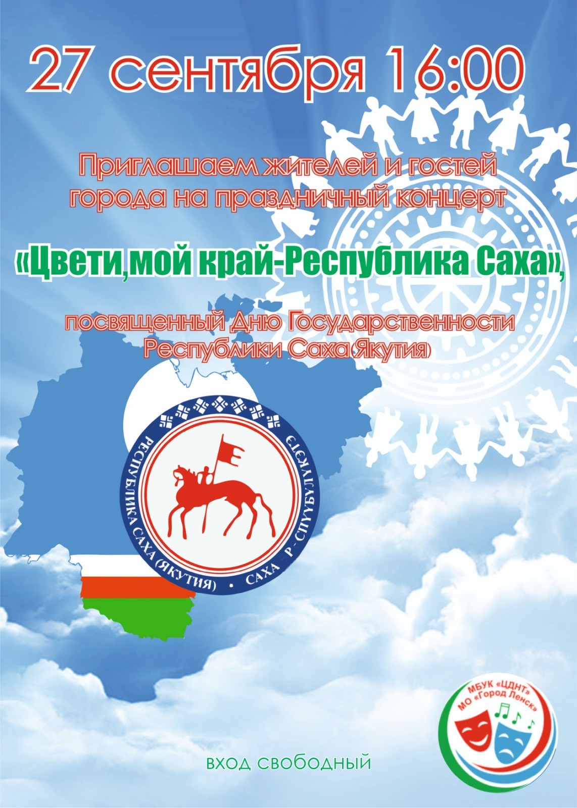 27 сентября в 16:00 ЦДНТ приглашает жителей и гостей города на праздничный концерт «Цвети, мой край - Республика Саха», посвященный Дню Государственности Республики Саха (Якутия). Вход свободный