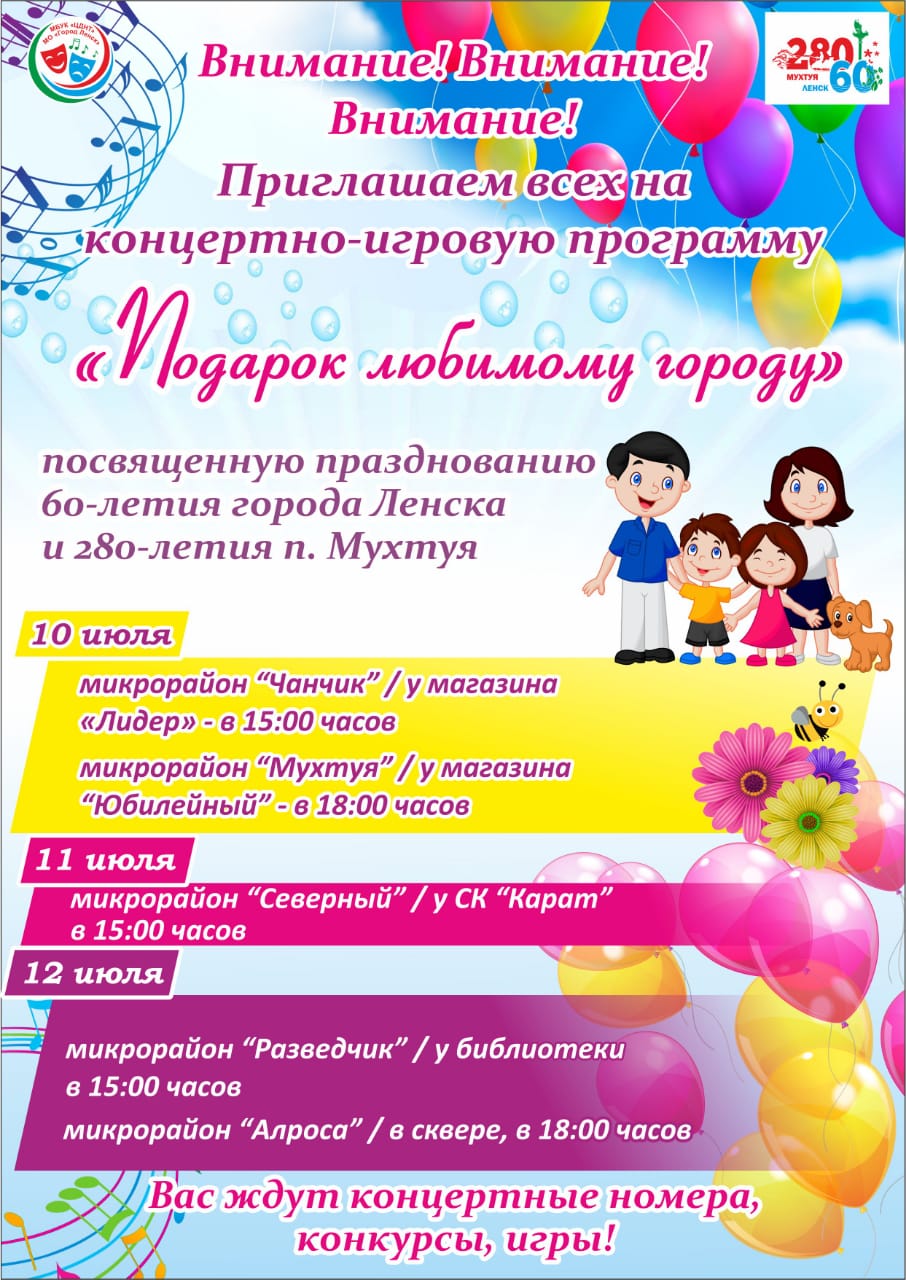 Приглашаем всех на концертно-игровую программу «Подарок любимому городу», посвященную празднованию 60-летия города Ленска и 280-летия п. Мухтуя.