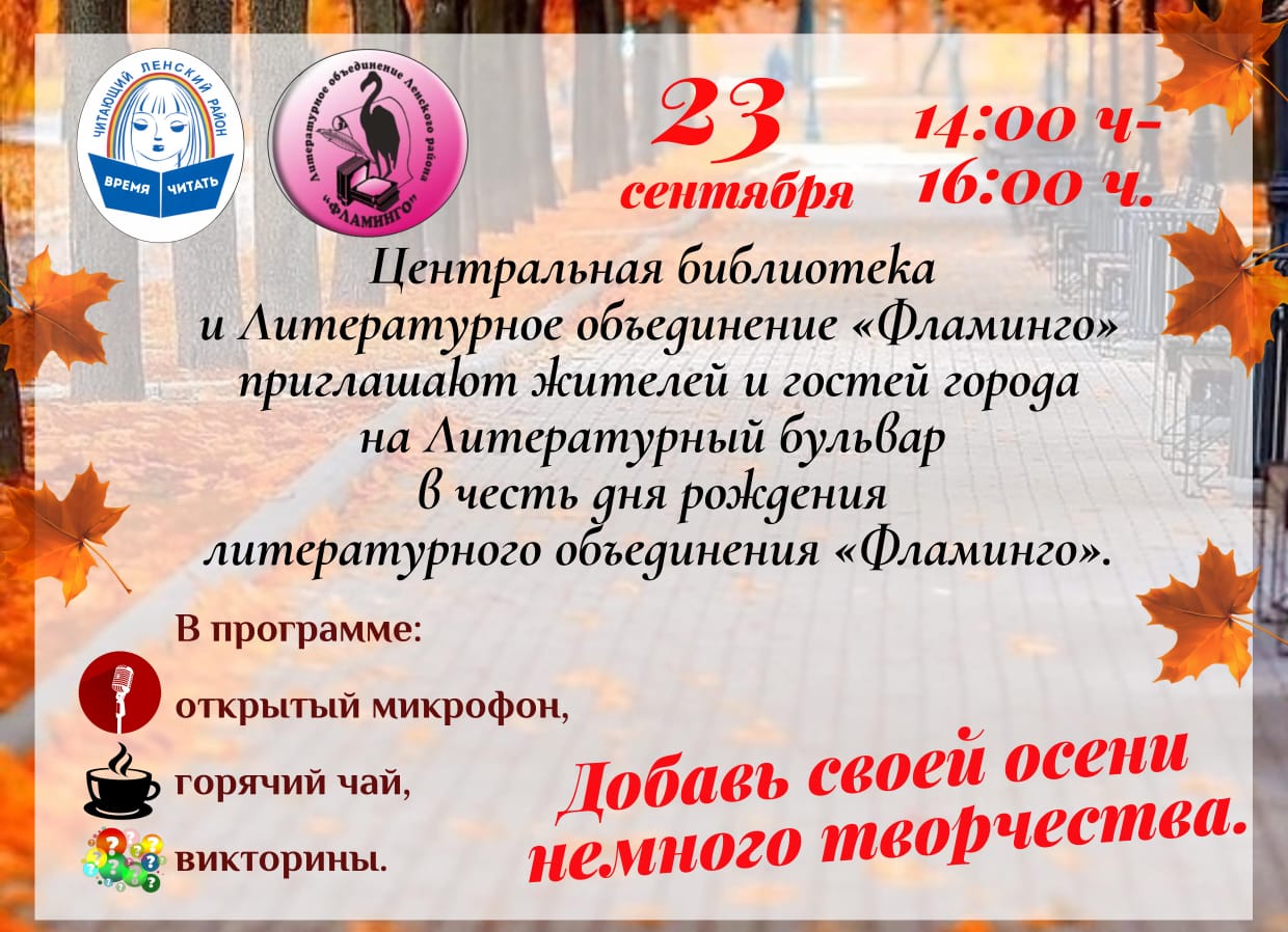 23 сентября Центральная библиотека и Литературное объединение «Фламинго» приглашают жителей и гостей города на Литературный бульвар в честь дня рождения литературного объединения «Фламинго».