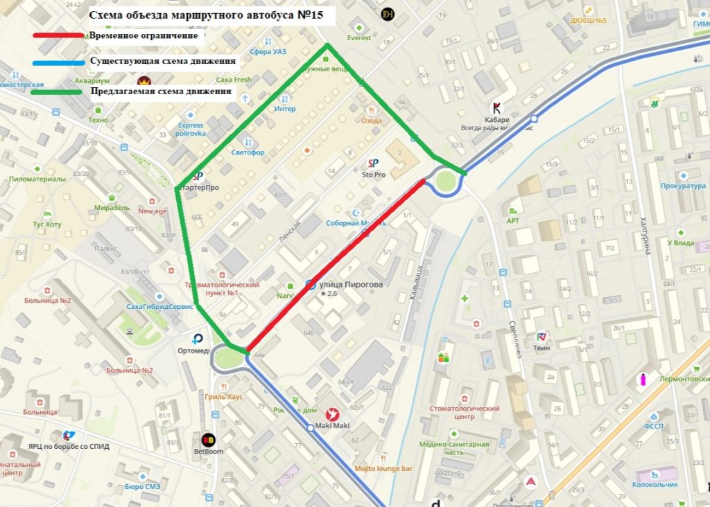 В среду, 10 апреля, на время перекрытия улицы Пирогова в Якутске изменится маршрут автобуса № 15. Как ЯСИА сообщили в окружной администрации, временная схема будет действовать до открытия движения в 09:00.