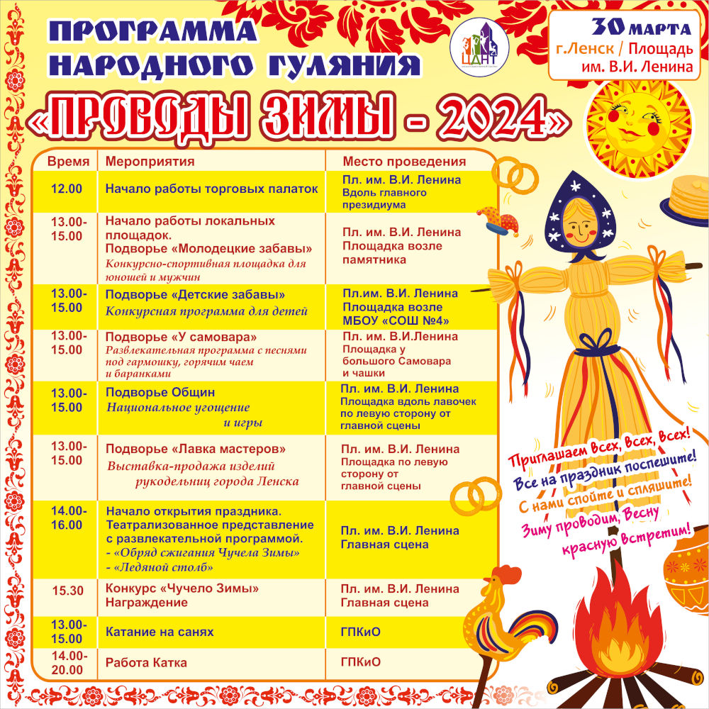 Развлекательная программа для взрослых и детей, театрализованное представление «Обряд сжигания Чучела Зимы», катание на санях и многое другое. В день проводов зимы ленчан ожидает насыщенная программа!