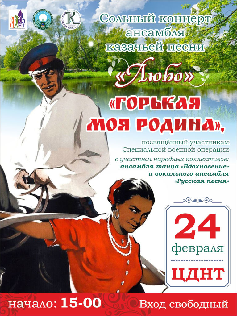 24 февраля ЦДНТ приглашает на сольный концерт ансамбля «Любо» «Горькая моя Родина», посвящённый участникам специальной военной операции.