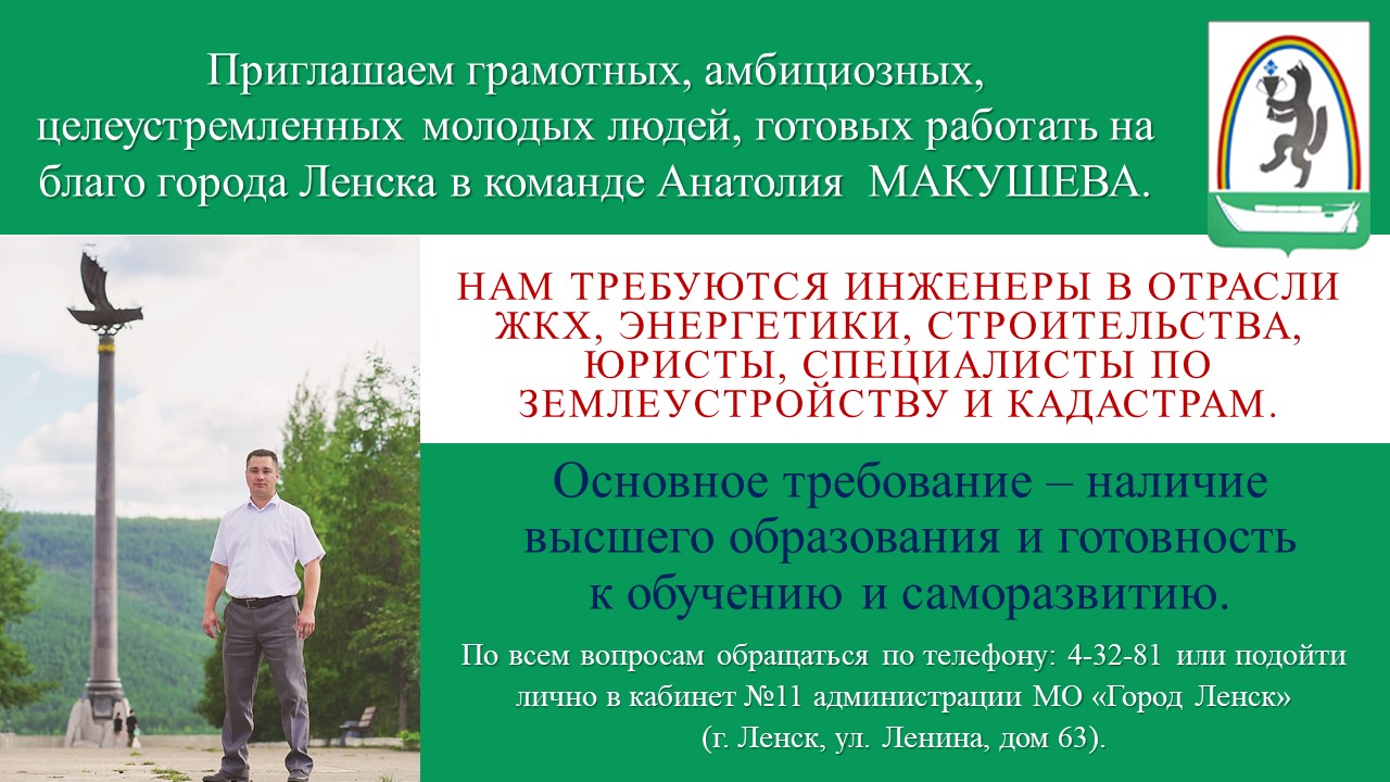 Приглашаем грамотных, амбициозных, целеустремленных молодых людей, готовых работать на благо города Ленска в команде Анатолия МАКУШЕВА.