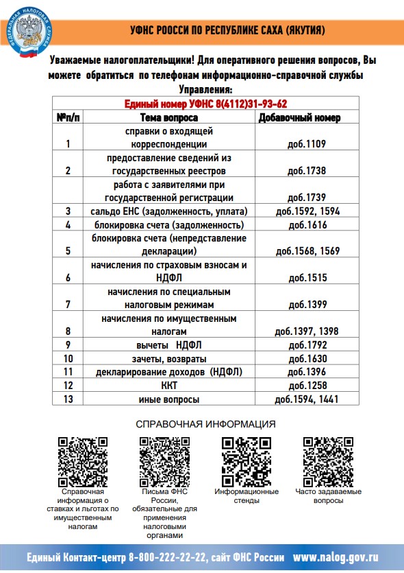 Для оперативного решения вопросов налогоплательщики могут обратиться по добавочным номерам информационно-справочной службы Управления.
