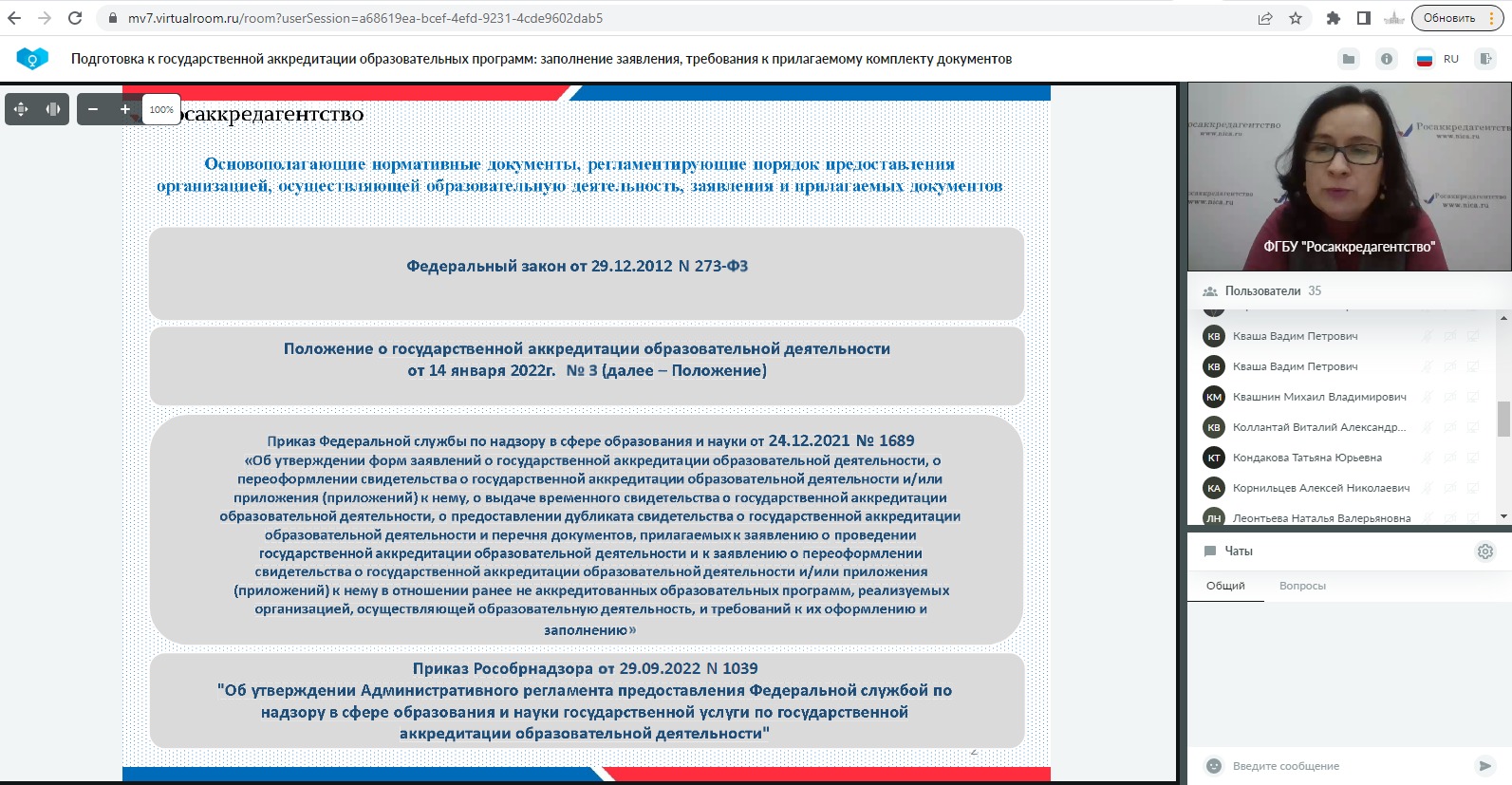 Работа вебинара была направлена на получение участниками практических рекомендаций по заполнению заявления на государственную аккредитацию и соблюдению требований к прилагаемому комплекту документов.
