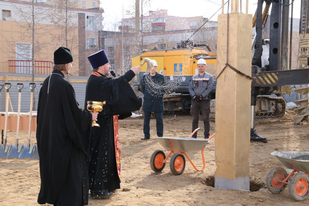 18 мая 2023 года благочинный Мирнинского округа протоиерей Владимир Севрюков принял участие в церемонии установки первой сваи строящегося спортивного зала Политехнического лицея.