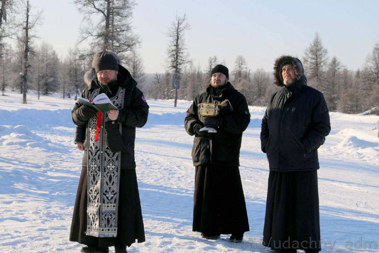 У Поклонного креста благочинный Мирнинского округа протоиерей Владимир Севрюков, настоятель храма прп. Серафима Саровского г. Удачный иерей Сергий Паршин и настоятель Успенского храма в селе Нюя иерей Дионисий Сеничев совершили водосвятный молебен, после чего отец Владимир отметил: