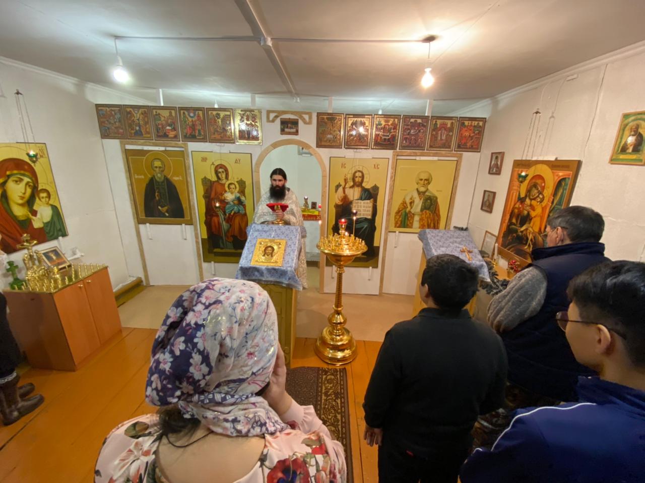 Затем священник совершил молебен в часовне свт. Луки Крымского при больнице посёлка, поздравил с праздником медперсонал и пациентов, окропил помещение и палаты крещенской водой. Также священник причастил на дому тех, кто по болезни не смог прийти на службу. Вечером того же дня было совершено Таинство Соборования.