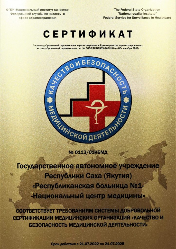 В 2022 году Национальный центр медицины имени М.Е. Николаева успешно прошел добровольную сертификацию медицинских организаций «Качество и безопасность медицинской деятельности» Национального института качества Росздравнадзора. Эксперты, проводившие внешний аудит, зафиксировали высокий уровень соответствия практическим рекомендациям по организации внутреннего контроля качества и безопасности медицинской деятельности в медицинской организации. А в июне этого года в результате подписания соглашения между Министерством здравоохранения Республики Саха (Якутия) и ФГБУ «Национальный институт качества» Росздравнадзора на базе Национального центра медицины имени М.Е. Николаева был создан Региональный центр компетенций в области качества и безопасности медицинской деятельности, что дает возможность делиться опытом и знаниями по обеспечению безопасности медицинской деятельности с коллегами из других медицинских организаций республики.