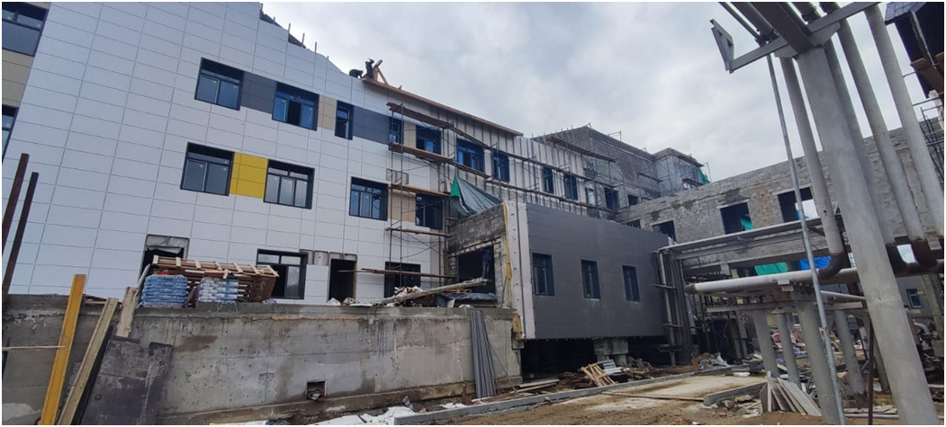 Больничный комплекс на 45 коек с поликлиникой на 104 посещения в смену возводится в поселке Усть-Мая по нацпроекту «Здравоохранение». На сегодня строительная готовность объекта составила 76%, сообщает Минстрой Якутии.