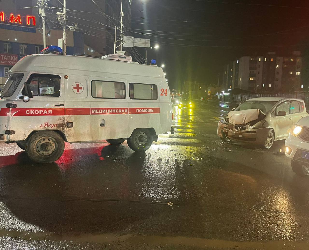 Вечером 7 октября в Якутске на перекрестке улиц Петра Алексеева и Лермонтова столкнулись легковушка Toyota Ractis и автомобиль скорой медицинской помощи.