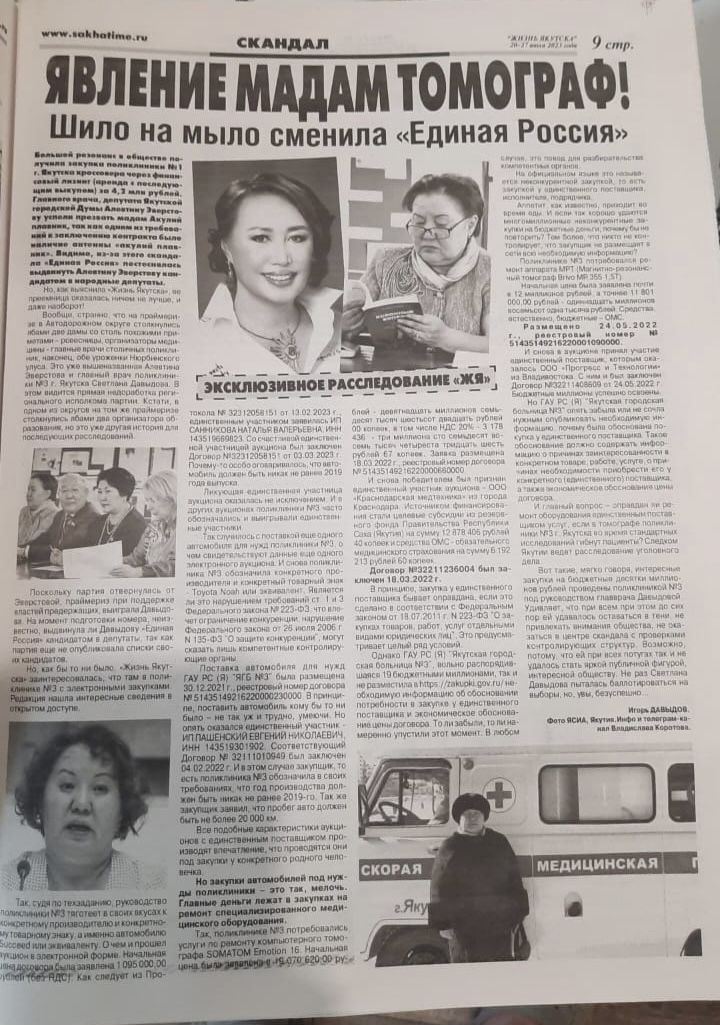 В это трудно поверить, мы и сами в этом усомнились, но «Жизнь Якутска» оказалась права… в части того, что Алевтина ЭВЕРСТОВА, главный врач поликлиники №1 г. Якутска, депутат Якутской городской Думы и Светлана ДАВЫДОВА,